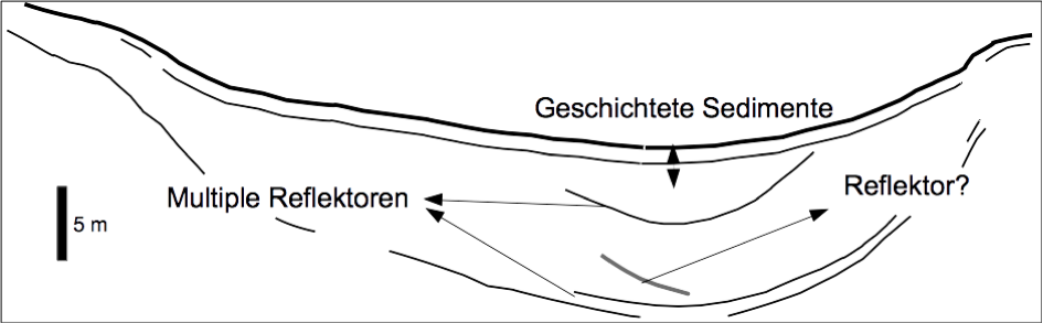 — Die im LfU-Bericht als „geschichtete Sedimente“ indizierten Reflexionen in den obersten 1 – 2 m unter dem Seeboden entpuppen sich als ein seismisches Artefakt in Form der wohlbekannten Geist-Reflexionen an der Wasseroberfläche.