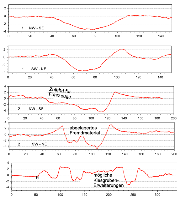 Abb. 12. DGM 1-Profile in 10 cm Höhenauflösung über den in Abb. 11 markierten Kratern. Die Durchmesser liegen bei grob 50-80 m (Wallkronen) mit Tiefen von 3-5 m und Wallhöhen zwischen grob 0,5 und 2 m.