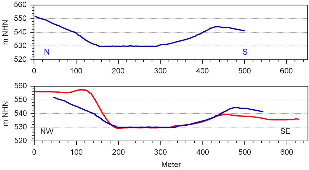 Abb. 6. DGM 1-Profile durch den Begleitkrater. Die absolute Kongruenz der beiden sich kreuzenden Profile im Inneren über eine Strecke von 250 m verlangt eine Kraterbildung von oben und in jüngster geologischer Zeit ohne folgende Sedimentation und Erosion